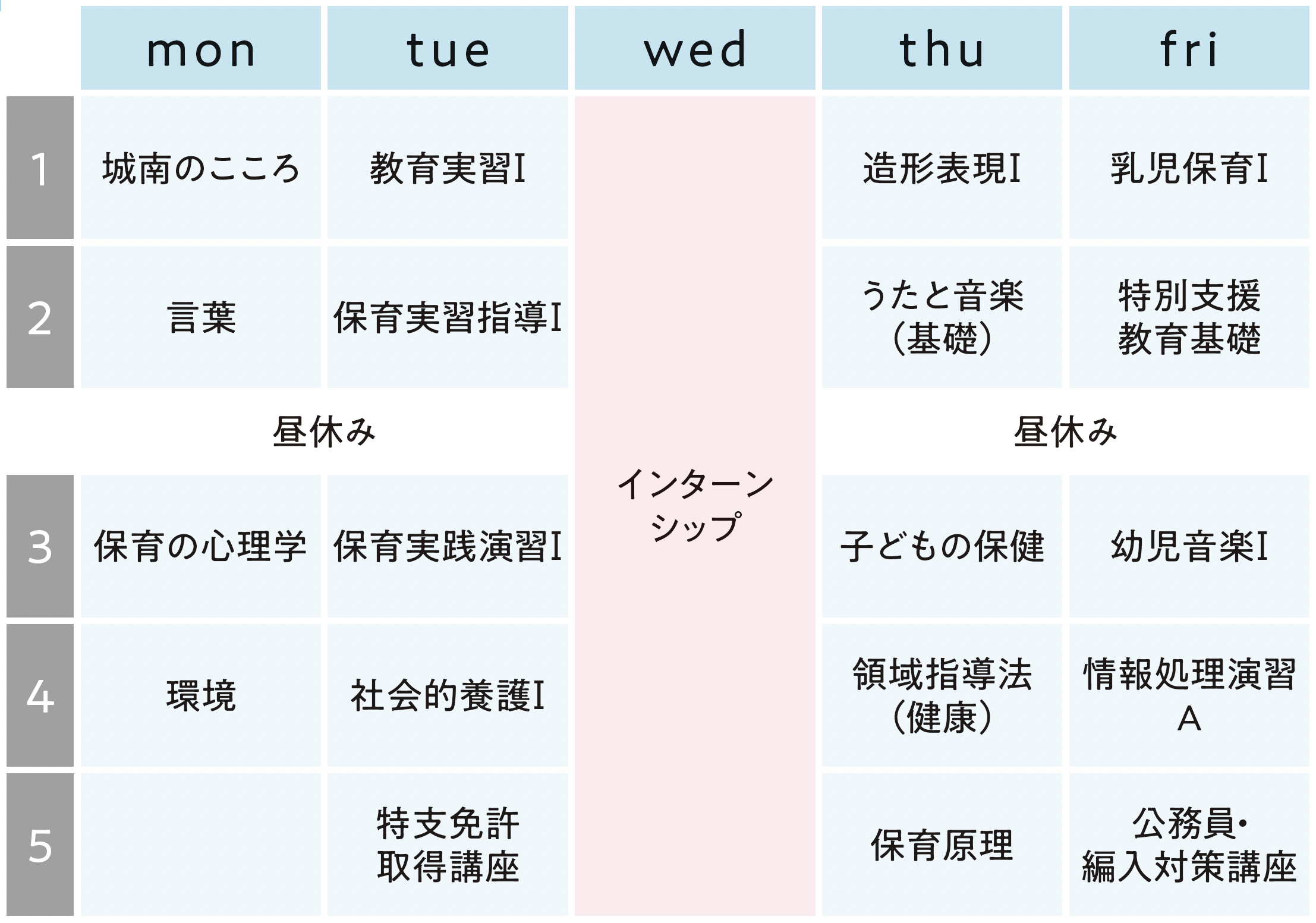 | 実習 | 教育実習Ⅰ・Ⅱ/保育実習Ⅰ〜Ⅲ/保育実習指導Ⅰ〜Ⅲ |